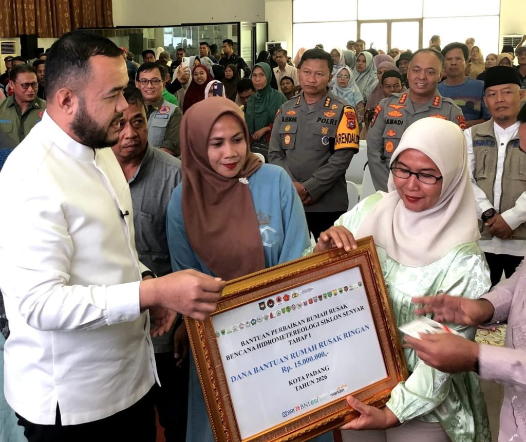 PADANG, INVESTIGASI, Pemko Padang menyerahkan bantuan perbaikan rumah rusak ringan dan rusak sedang tahap I bagi korban banjir, Jumat (13/2/2026).