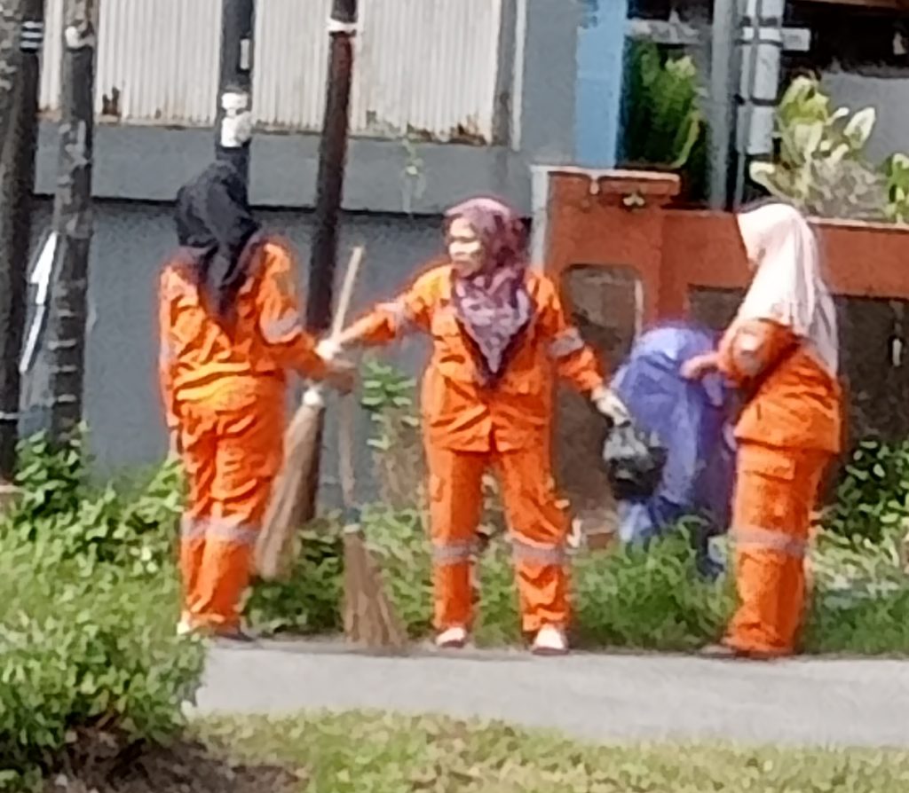 Selesai sholat subuh, disaat warga berolahraga, setelah menunaikan kewajiban di mesjid atau mushalla, pasukan oranye sudah mulai bekerja. Jalan dilalui sudah rapi, membuat suasana olahraga pagi, memikat hati. Warga berpeci, berbalut mukenah, semakin bergairah berolahraga di jalan yang bersih, indah berseri, menyambut mentari pagi.